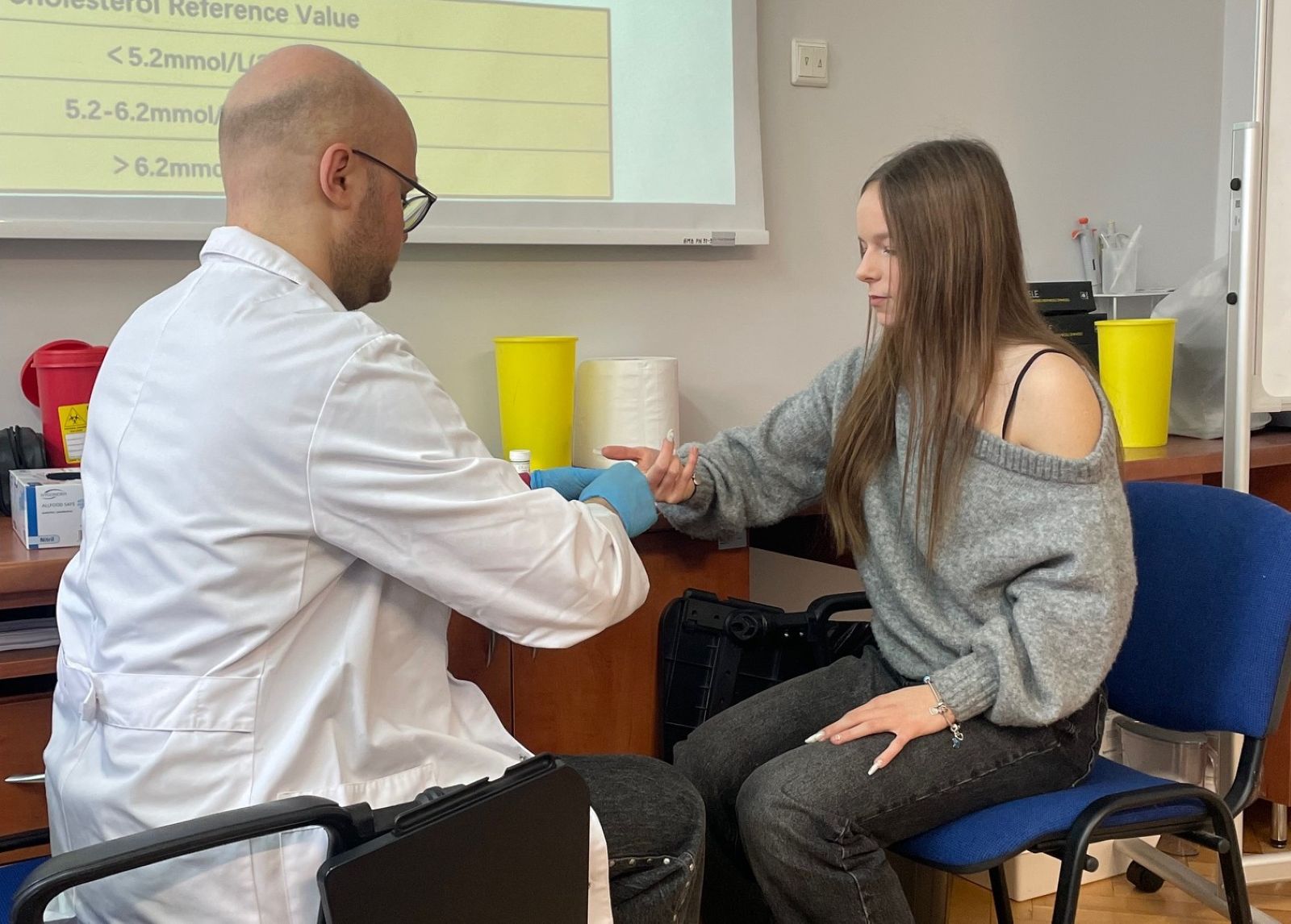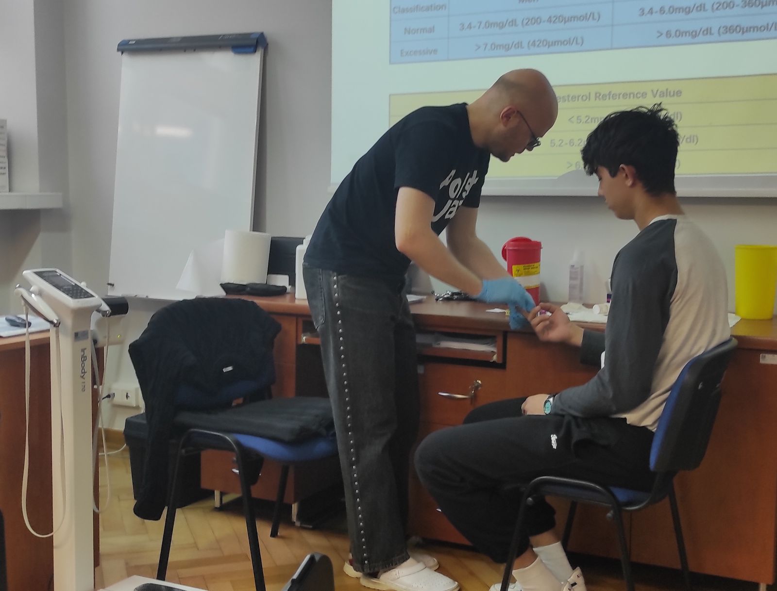 W części praktycznej uczestnicy oceniali w próbkach krwi włośniczkowej stężenie glukozy, cholesterolu całkowitego oraz kwasu moczowego, a także analizowali skład swojego ciała.